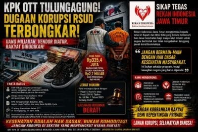 Tulungagung, Jawa Timur — Operasi Tangkap Tangan (OTT) yang dilakukan Komisi Pemberantasan Korupsi (KPK) Jum at – 10 April 2026 di Kabupaten Tulungagung kembali membuka tabir gelap dugaan praktik korupsi di sektor kesehatan daerah. Kasus ini tidak hanya menyasar individu, tetapi mengindikasikan adanya jejaring sistematis dalam pengaturan proyek di RSUD.