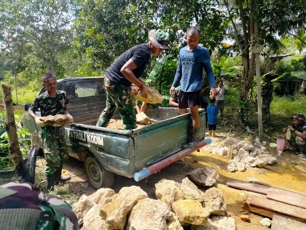 Bersama masyarakat setempat, personel Satgas TMMD bahu-membahu mengerjakan pembangunan jembatan yang menjadi akses vital bagi aktivitas warga sehari-hari. Semangat gotong royong tampak jelas dalam setiap proses pengerjaan, mulai dari penyiapan material hingga tahap konstruksi.